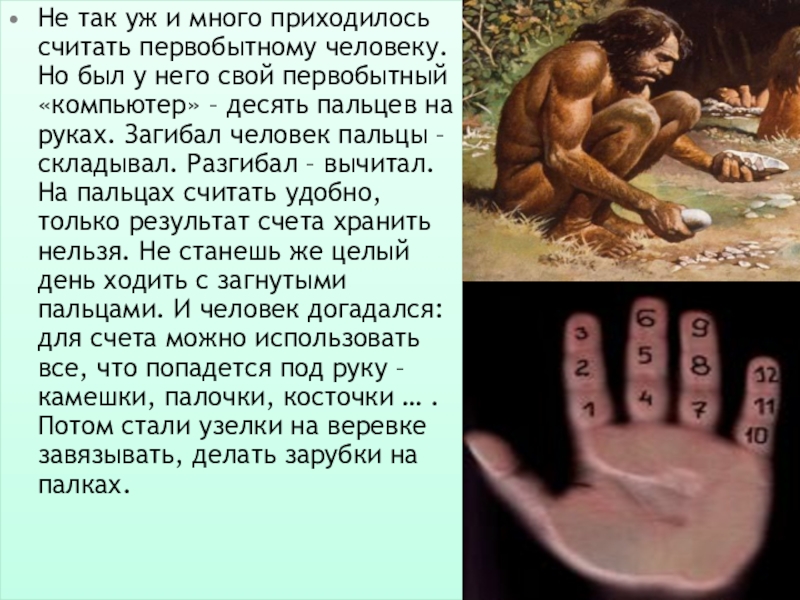 у него свой первобытный «компьютер» – десять пальцев на руках. Загибал человек пальцы – складывал. Разгибал – вычитал. На пальцах считать удобно, только результат счета хранить нельзя. Не станешь же целый день ходить с загнутыми пальцами. И человек догадался: для счета можно использовать все, что попадется под руку – камешки, палочки, косточки … . Потом стали узелки на веревке завязывать, делать зарубки на палках.