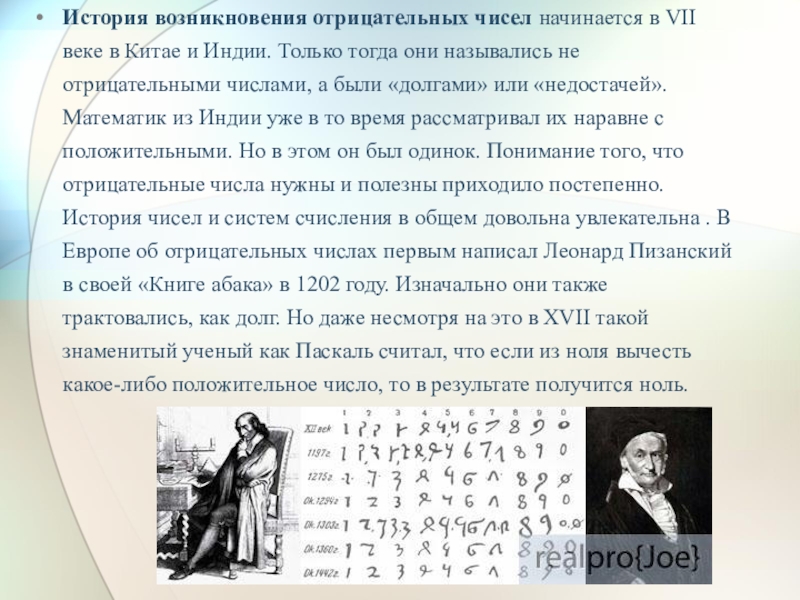 Только тогда они назывались не отрицательными числами, а были «долгами» или «недостачей». Математик из Индии уже в то время рассматривал их наравне с положительными. Но в этом он был одинок. Понимание того, что отрицательные числа нужны и полезны приходило постепенно. История чисел и систем счисления в общем довольна увлекательна . В Европе об отрицательных числах первым написал Леонард Пизанский в своей «Книге абака» в 1202 году. Изначально они также трактовались, как долг. Но даже несмотря на это в XVII такой знаменитый ученый как Паскаль считал, что если из ноля вычесть какое-либо положительное число, то в результате получится ноль.