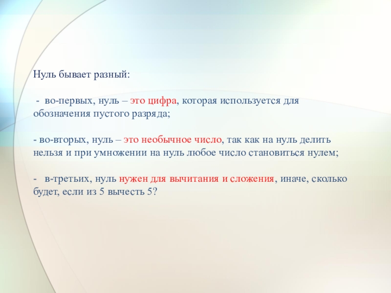 - во-вторых, нуль – это необычное число, так как на нуль делить нельзя и при умножении на нуль любое число становиться нулем;