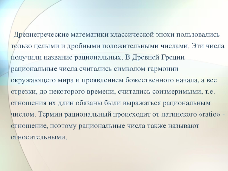 Слайд 20 Древнегреческие математики классической эпохи пользовались только целыми и