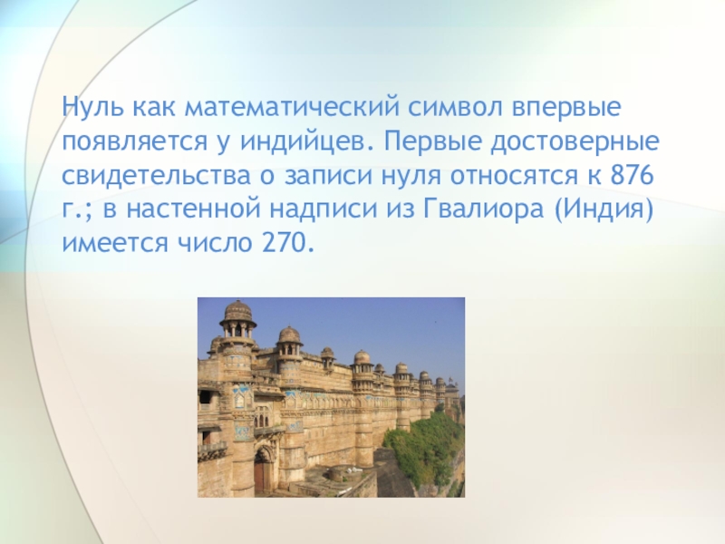 Слайд 15Нуль как математический символ впервые появляется у индийцев. Первые достоверные свидетельства