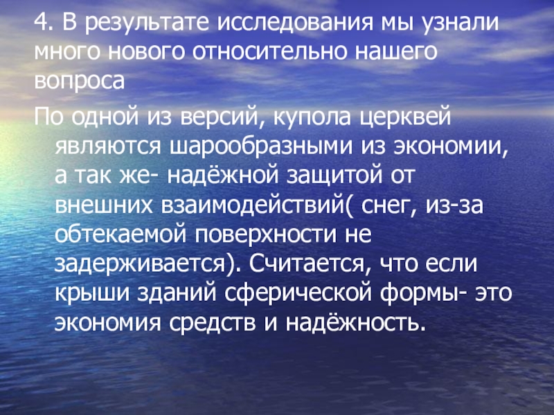4. В результате исследования мы узнали много нового относительно нашего вопросаПо одной из версий, купола церквей являются