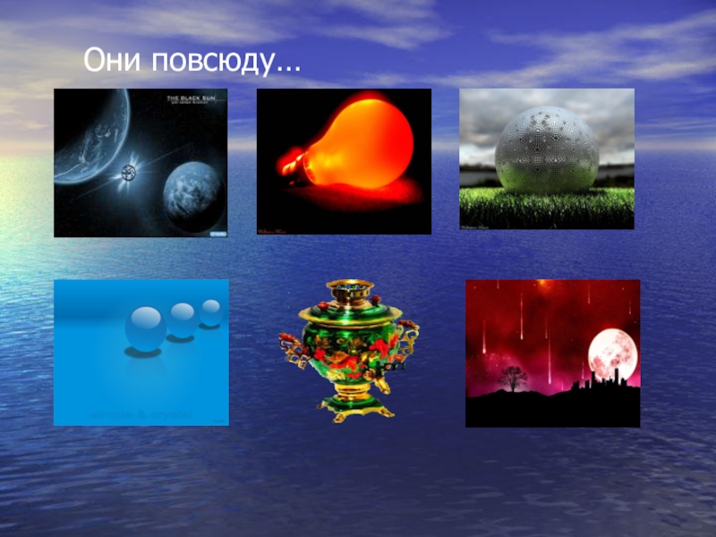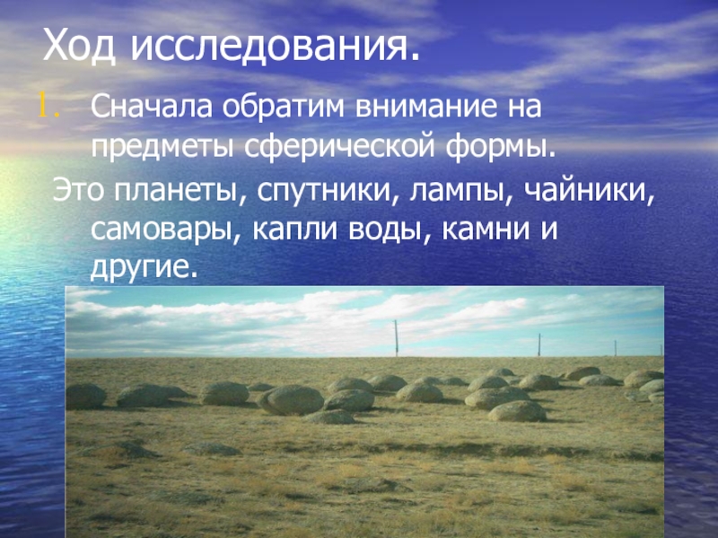 Ход исследования.Сначала обратим внимание на предметы сферической формы. Это планеты, спутники, лампы, чайники, самовары, капли воды, камни
