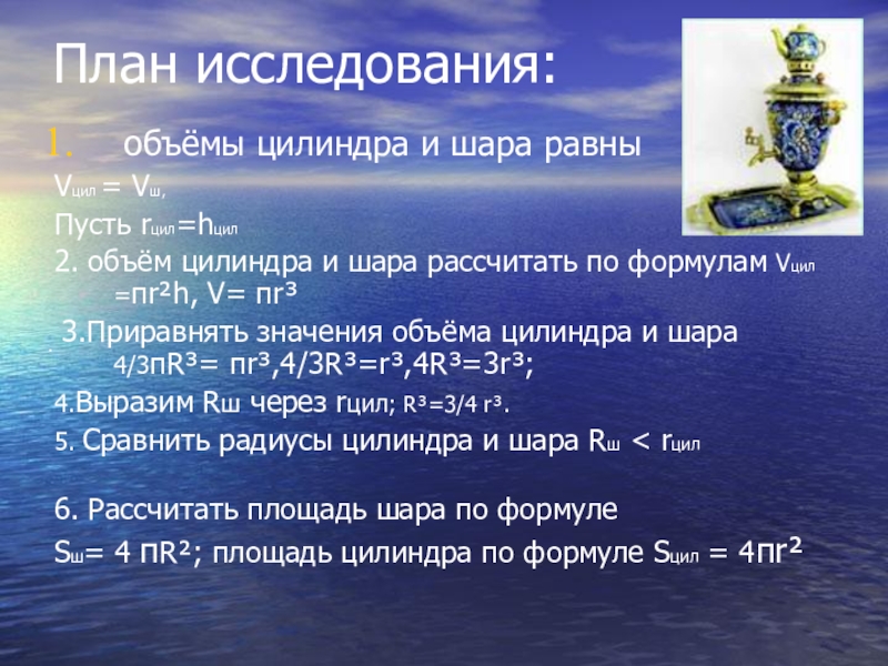 План исследования:  объёмы цилиндра и шара равныVцил = Vш, Пусть rцил=hцил2. объём цилиндра и шара рассчитать