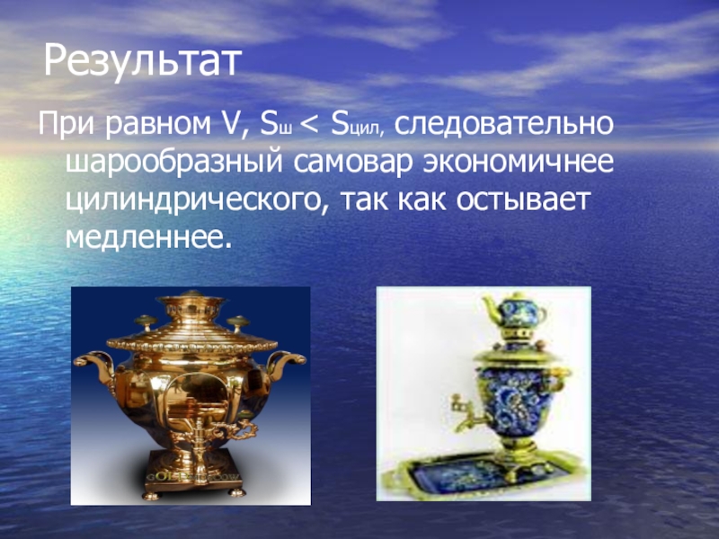 РезультатПри равном V, Sш < Sцил, следовательно шарообразный самовар экономичнее цилиндрического, так как остывает медленнее.