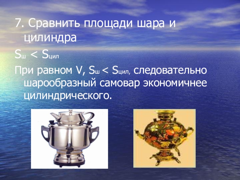 7. Сравнить площади шара и цилиндраSш < SцилПри равном V, Sш < Sцил, следовательно шарообразный самовар экономичнее