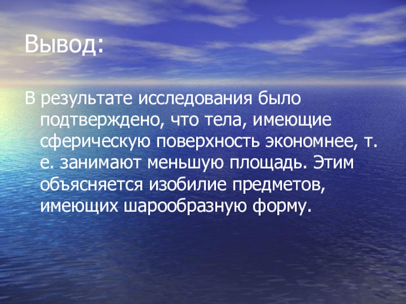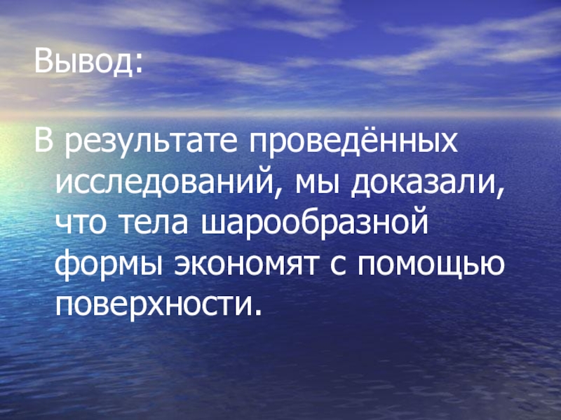 Вывод:В результате проведённых исследований, мы доказали, что тела шарообразной формы экономят с помощью поверхности.