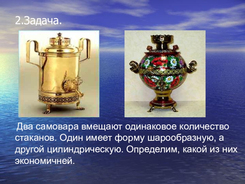 2.Задача. Два самовара вмещают одинаковое количество стаканов. Один имеет форму шарообразную, а другой цилиндрическую. Определим, какой из