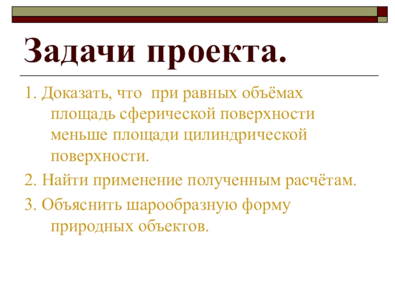 Задачи проекта.1. Доказать, что при равных объёмах площадь сферической поверхности меньше площади цилиндрической поверхности.2. Найти применение полученным