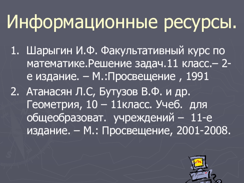 Информационные ресурсы.1. Шарыгин И.Ф. Факультативный курс по математике.Решение задач.11 класс.– 2-е издание. – М.:Просвещение , 1991 2.