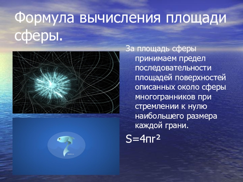 Формула вычисления площади сферы.За площадь сферы принимаем предел последовательности площадей поверхностей описанных около сферы многогранников при стремлении