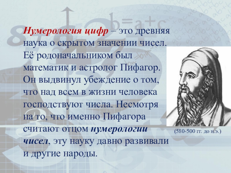 родоначальником был математик и астролог Пифагор. Он выдвинул убеждение о том, что над всем в жизни человека господствуют числа. Несмотря на то, что именно Пифагора считают отцом нумерологии чисел, эту науку давно развивали и другие народы.