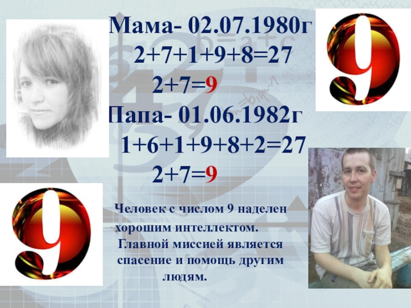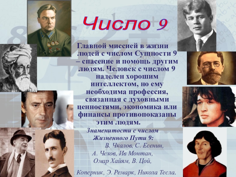 – спасение и помощь другим людям. Человек с числом 9 наделен хорошим интеллектом, но ему необходима профессия, связанная с духовными ценностями, экономика или финансы противопоказаны этим людям.