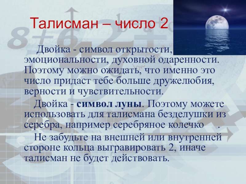 Двойка - символ луны. Поэтому можете использовать для талисмана безделушки из серебра, например серебряное колечко .