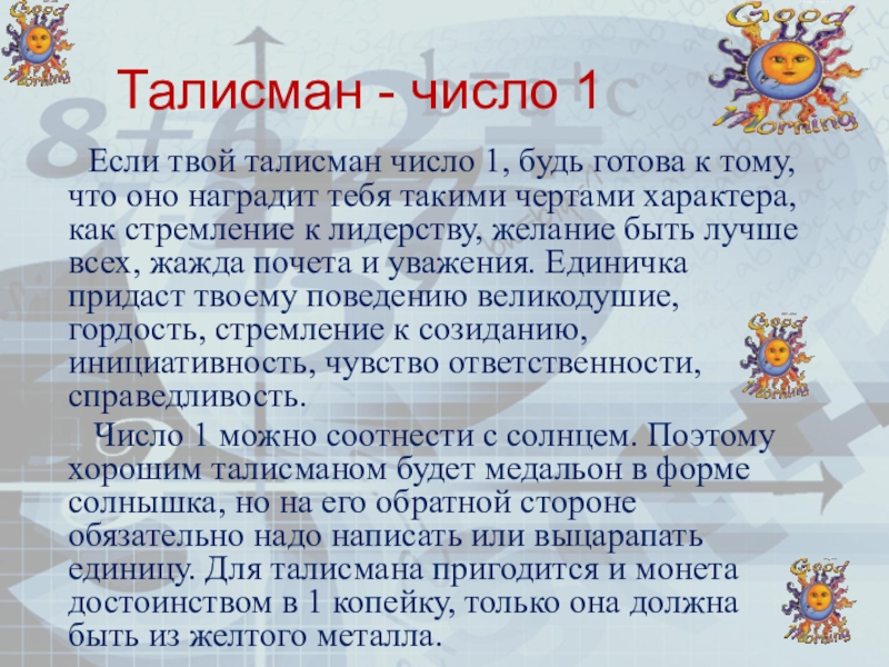 Число 1 можно соотнести с солнцем. Поэтому хорошим талисманом будет медальон в форме солнышка, но на его обратной стороне обязательно надо написать или выцарапать единицу. Для талисмана пригодится и монета достоинством в 1 копейку, только она должна быть из желтого металла.