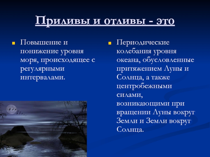 Периодические колебания уровня океана, обусловленные притяжением Луны и Солнца, а также центробежными силами, возникающими при вращении Луны вокруг Земли и Земли вокруг Солнца.