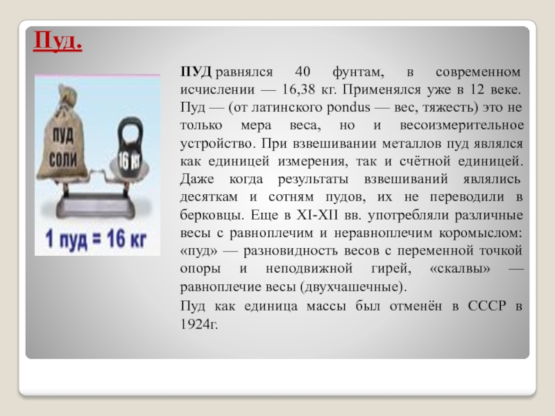 ПУД равнялся 40 фунтам, в современном исчислении — 16,38 кг. Применялся уже