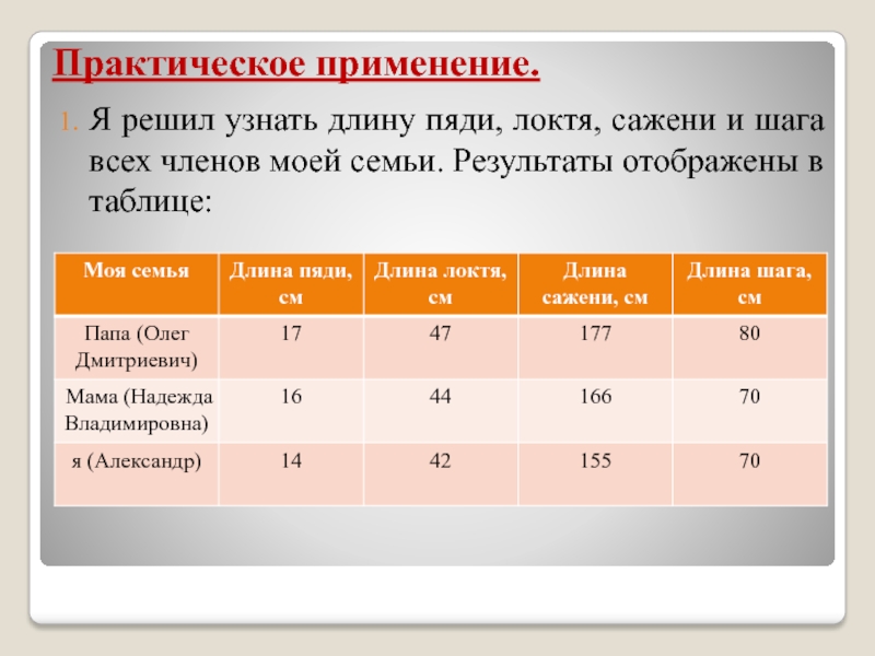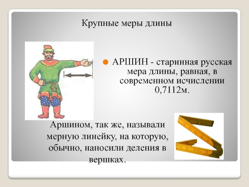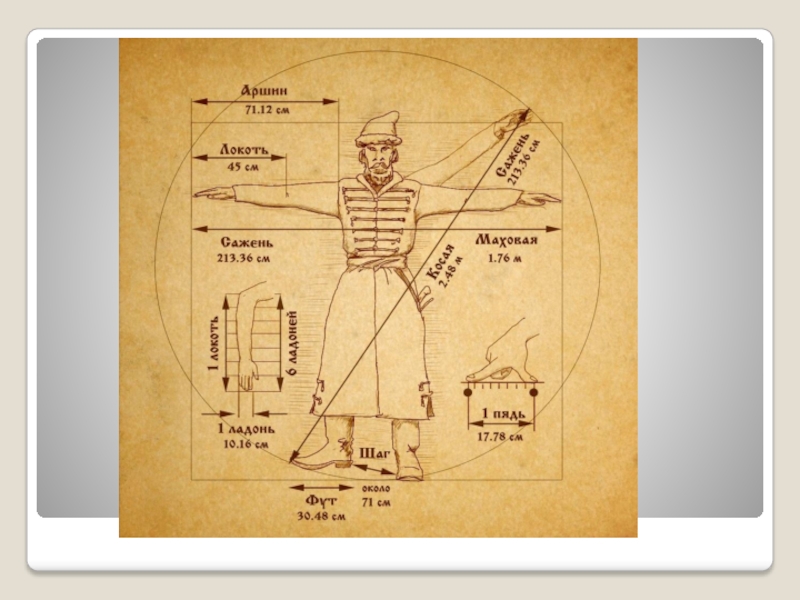 Но нужно отметить, что все они были не совсем точны. Так меры длины основывались на длинах различных частей тела человека (например, локоть) или на расстоянии (например, аршин ,длина человеческого шага). Но все люди разные, поэтому и единицы измерения длин были разные.