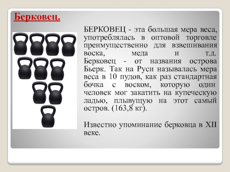 БЕРКОВЕЦ - эта большая мера веса, употреблялась в оптовой торговле преимущественно