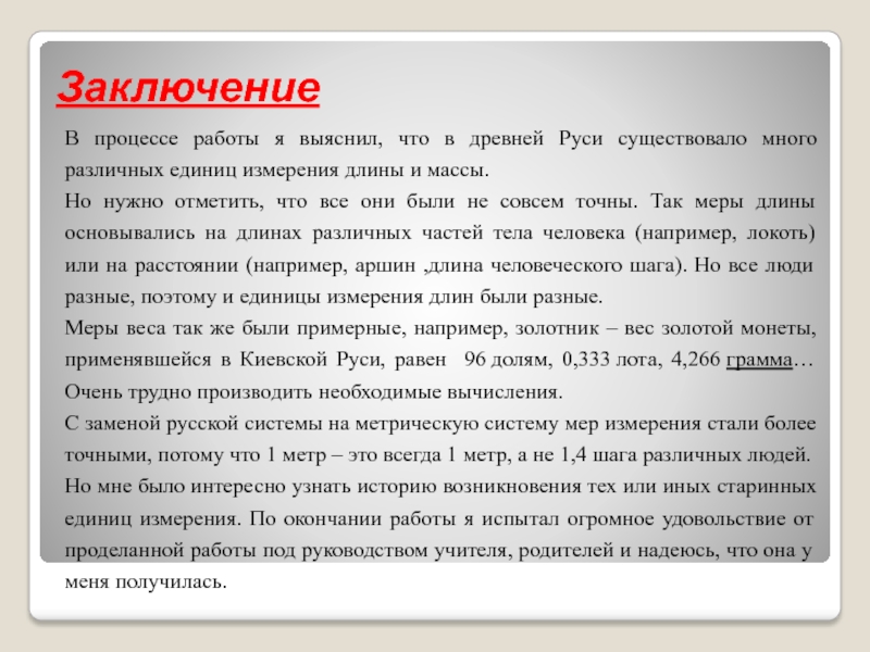 Но мне было интересно узнать историю возникновения тех или иных старинных единиц измерения. По окончании работы я испытал огромное удовольствие от проделанной работы под руководством учителя, родителей и надеюсь, что она у меня получилась.
