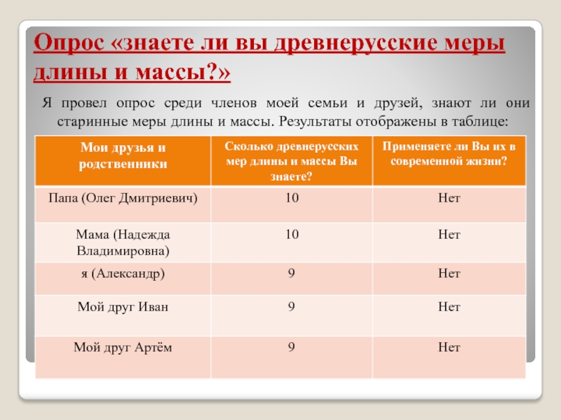 4. Опросить свою семью и друзей о древнерусских мерах длины и массы.