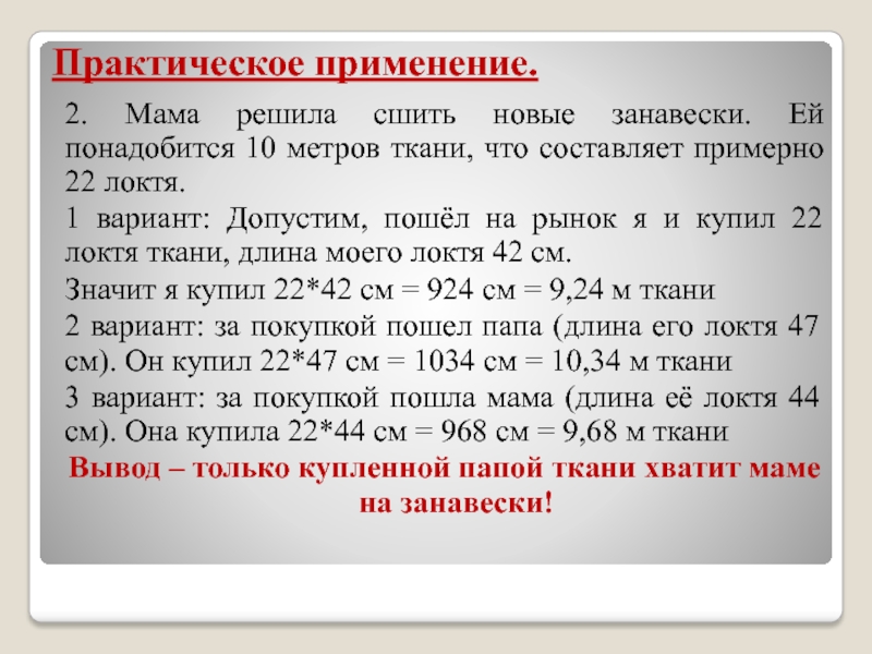 2 вариант: за покупкой пошел папа (длина его локтя 47 см). Он купил 22*47 см = 1034 см = 10,34 м ткани
