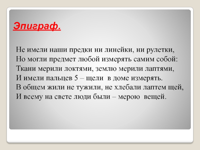 Слайд 13ЛОКОТЬ равнялся длине руки от пальцев до локтя (по другим данным