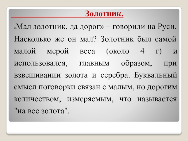 Насколько же он мал? Золотник был самой малой мерой веса (около 4 г) и использовался, главным образом, при взвешивании золота и серебра. Буквальный смысл поговорки связан с малым, но дорогим количеством, измеряемым, что называется "на вес золота".