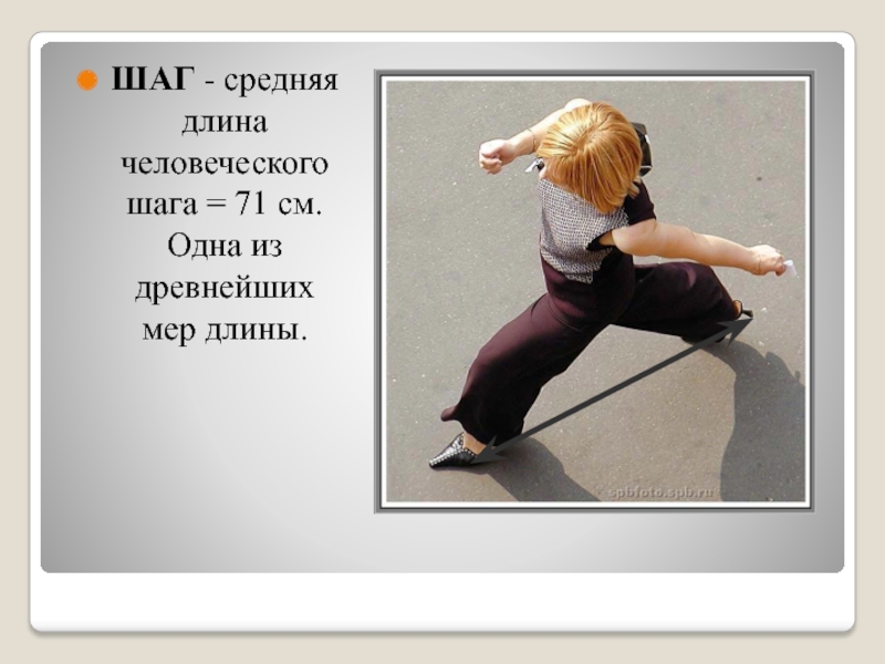 Слайд 9ШАГ - средняя длина человеческого шага = 71 см. Одна из