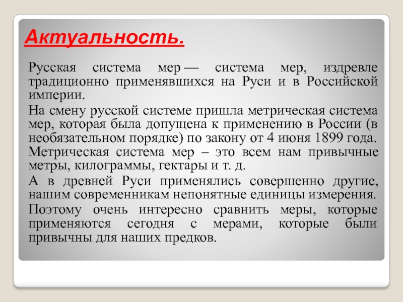 На смену русской системе пришла метрическая система мер, которая была допущена к применению в России (в необязательном порядке) по закону от 4 июня 1899 года. Метрическая система мер – это всем нам привычные метры, килограммы, гектары и т. д.