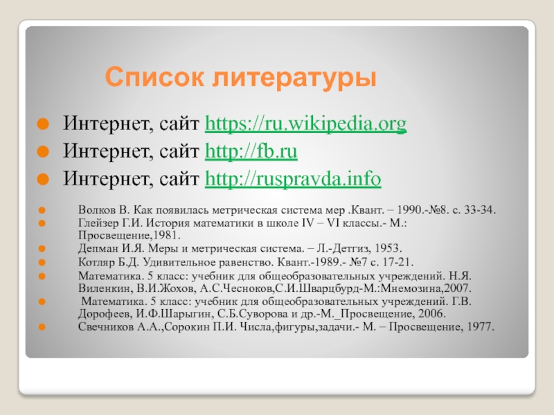 Депман И.Я. Меры и метрическая система. – Л.-Детгиз, 1953.