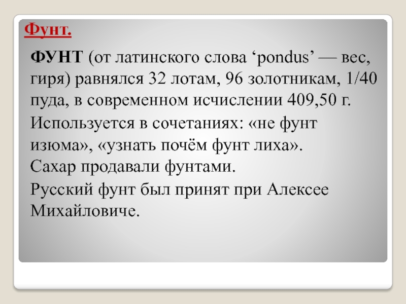 ФУНТ (от латинского слова ‘pondus’ — вес, гиря) равнялся 32 лотам, 96