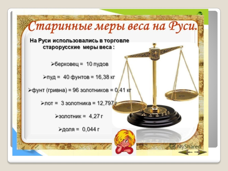 Меры веса так же были примерные, например, золотник – вес золотой монеты, применявшейся в Киевской Руси, равен 96 долям, 0,333 лота, 4,266 грамма… Очень трудно производить необходимые вычисления.