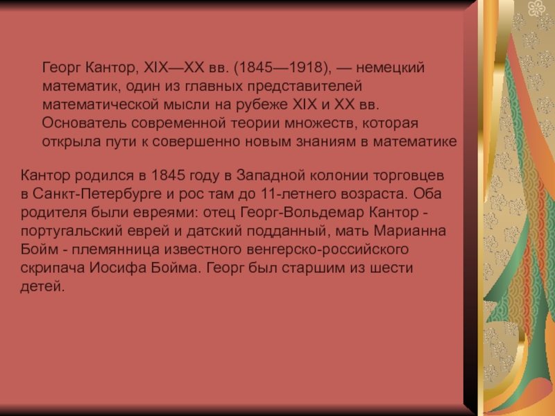 Кантор родился в 1845 году в Западной колонии торговцев в Санкт-Петербурге и рос там до 11-летнего возраста. Оба родителя были евреями: отец Георг-Вольдемар Кантор - португальский еврей и датский подданный, мать Марианна Бойм - племянница известного венгерско-российского скрипача Иосифа Бойма. Георг был старшим из шести детей.