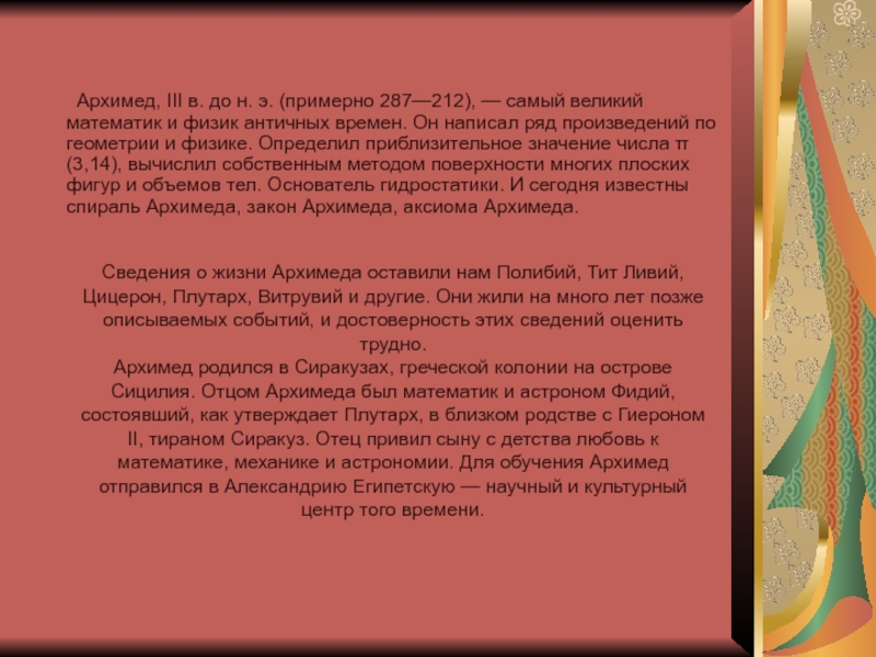 Сведения о жизни Архимеда оставили нам Полибий, Тит Ливий, Цицерон, Плутарх, Витрувий и другие. Они жили на много лет позже описываемых событий, и достоверность этих сведений оценить трудно.