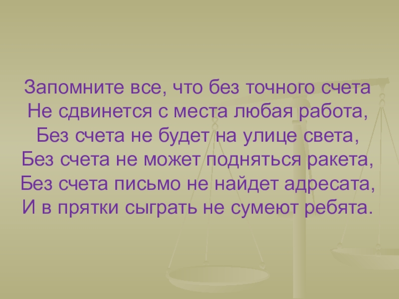 Запомните все, что без точного счета Не сдвинется с места любая работа, Без счета не будет на улице света, Без счета не может подняться ракета, Без счета письмо не найдет адресата, И в прятки