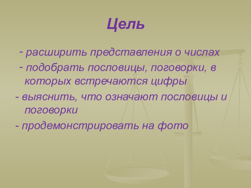 Цель - расширить представления о числах - подобрать пословицы, поговорки, в которых встречаются цифры- выяснить, что означают
