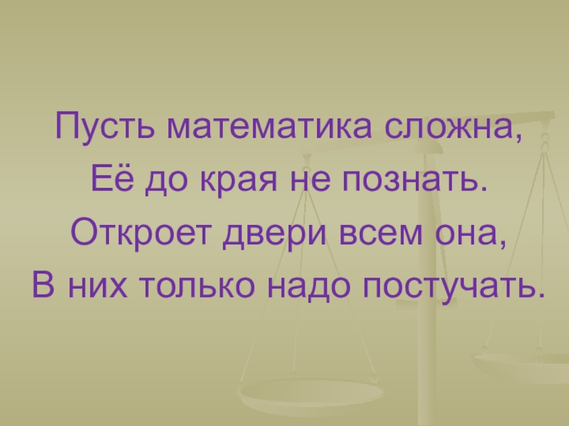 Пусть математика сложна,Её до края не познать.Откроет двери всем она, В них только надо постучать.
