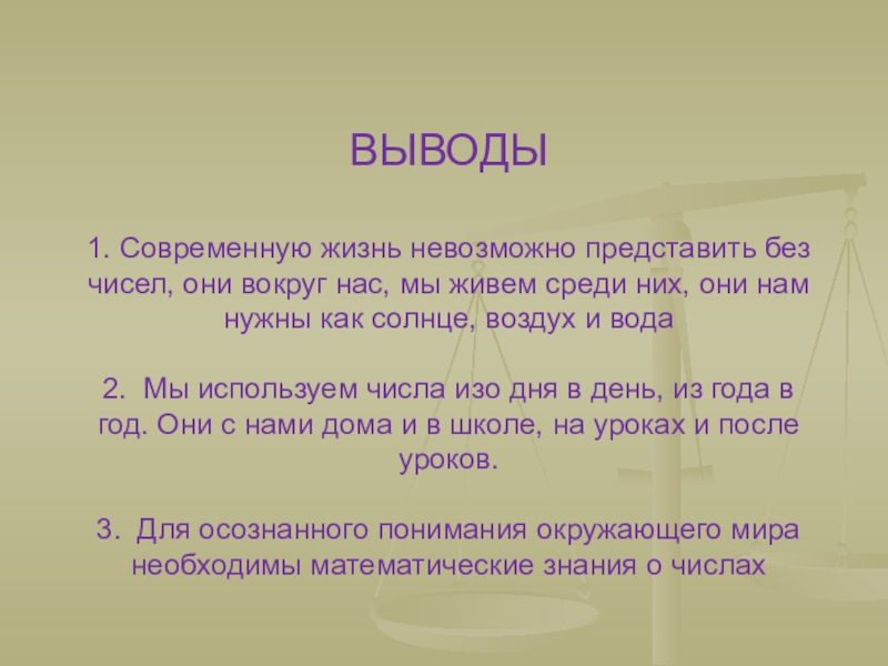 Слайд 15 ВЫВОДЫ 1. Современную жизнь невозможно представить без чисел, они вокруг нас, мы