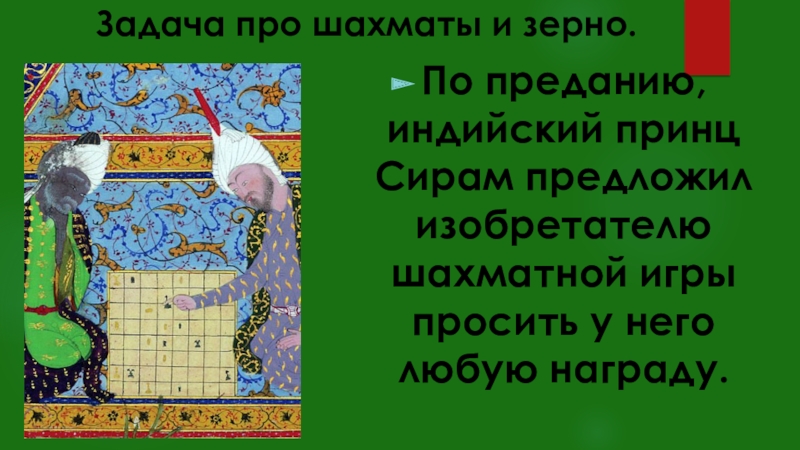 пшеничное зернышко, за второй-2, за третий-4 и т.д., увеличивая вдвое за каждый из следующих квадратов.