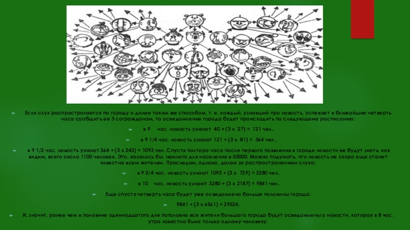 другим. Это потребовало также четверти часа. Значит, спустя полчаса после прибытия новости в город о ней знало уже 4 + (3 х 3) = 13 человек. Каждый из 9 вновь узнавших поделился в ближайшие четверть часа с 3 другими гражданами, так что к 8 3/4 часам утра новость стала известна