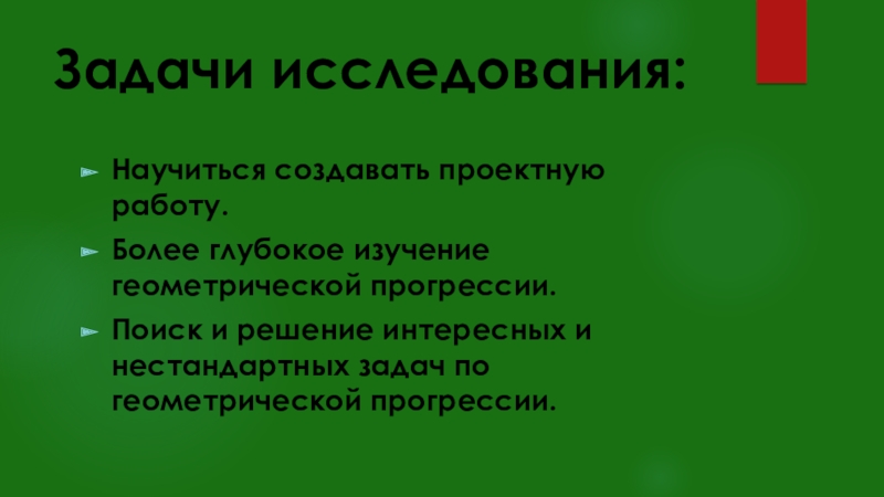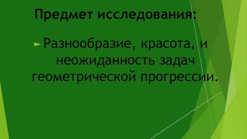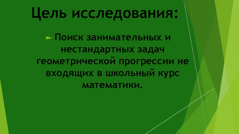 увидели настолько они отличаются друг от друга. Если арифметическая прогрессия увеличивается или уменьшается незначительно, то с геометрической прогрессией шутить нельзя и в это мы убедились когда разбирали задачу из учебника про изобретателя шахмат и царя, который хотел выкупить эту игру. После этого мне захотелось узнать, если ещё такие задачи, решение которых не укладывается в голове и ты не веришь в ответ пока сам не начнёшь их решать. Отсюда и появилась цель провести исследование по теме «Загадки геометрической прогрессии». И сейчас с результатом своей работы я вас познакомлю.