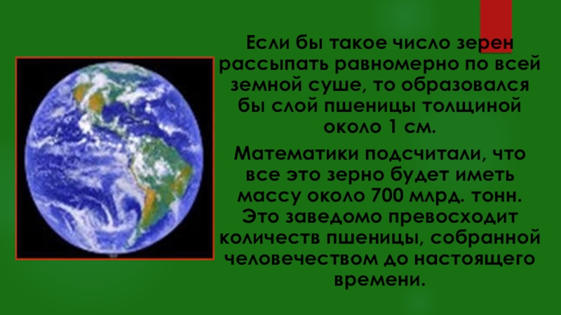 Слайд 15Если бы такое число зерен рассыпать равномерно по всей земной суше,