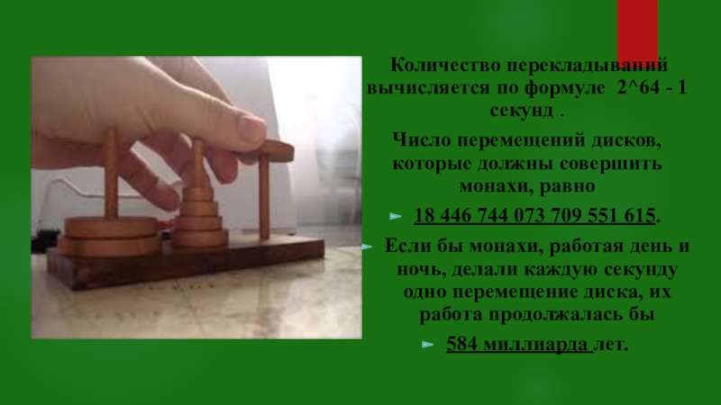 Количество перекладываний вычисляется по формуле 2^64 - 1 секунд .