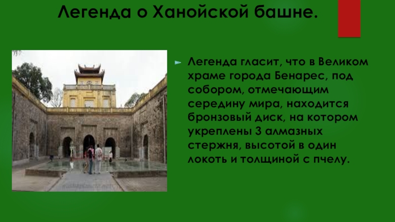 все 64 диска будут переложены со стержня, на который Брахма сложил их при создании мира, на другой стержень, башня вместе с храмом обратятся в пыль и под громовые раскаты погибнет мир.