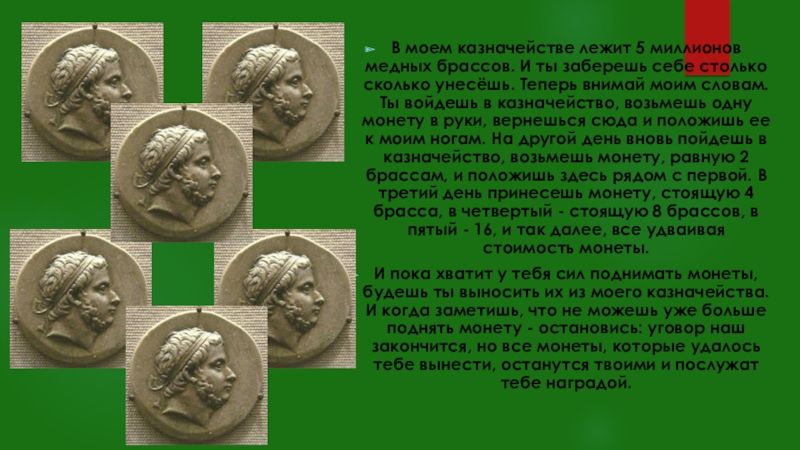 себе столько сколько унесёшь. Теперь внимай моим словам. Ты войдешь в казначейство, возьмешь одну монету в руки, вернешься сюда и положишь ее к моим ногам. На другой день вновь пойдешь в казначейство, возьмешь монету, равную 2 брассам, и положишь здесь рядом с первой. В третий день принесешь монету, стоящую 4 брасса, в четвертый - стоящую 8 брассов, в пятый - 16, и так далее, все удваивая стоимость монеты.