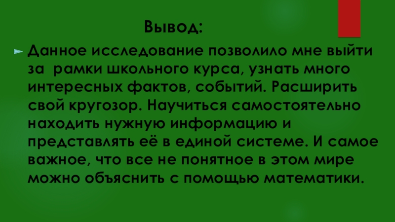 Данное исследование позволило мне выйти за рамки школьного курса, узнать много