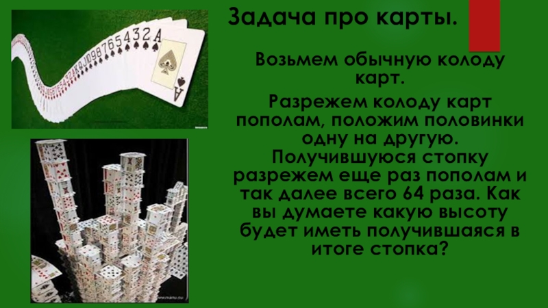 Разрежем колоду карт пополам, положим половинки одну на другую. Получившуюся стопку разрежем еще раз пополам и так далее всего 64 раза. Как вы думаете какую высоту будет иметь получившаяся в итоге стопка?