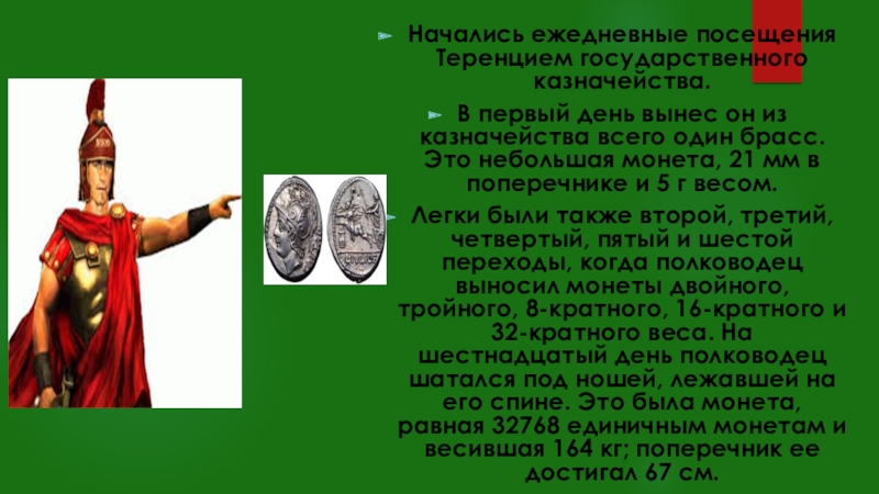 его посещения казначейства и странствования с ношей в приемную залу императора. Ему пришлось доставить на этот раз монету, соответствовавшую 131 072 единичным монетам. Она имела более метра в поперечнике и весила 655 кг. Пользуясь своим копьем как рычагом, Теренций с величайшим напряжением сил едва вкатил ее в залу. С грохотом упала монета к ногам императора.