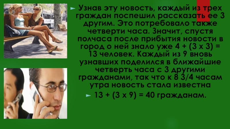 Слайд 33Узнав эту новость, каждый из трех граждан поспешил рассказать ее 3